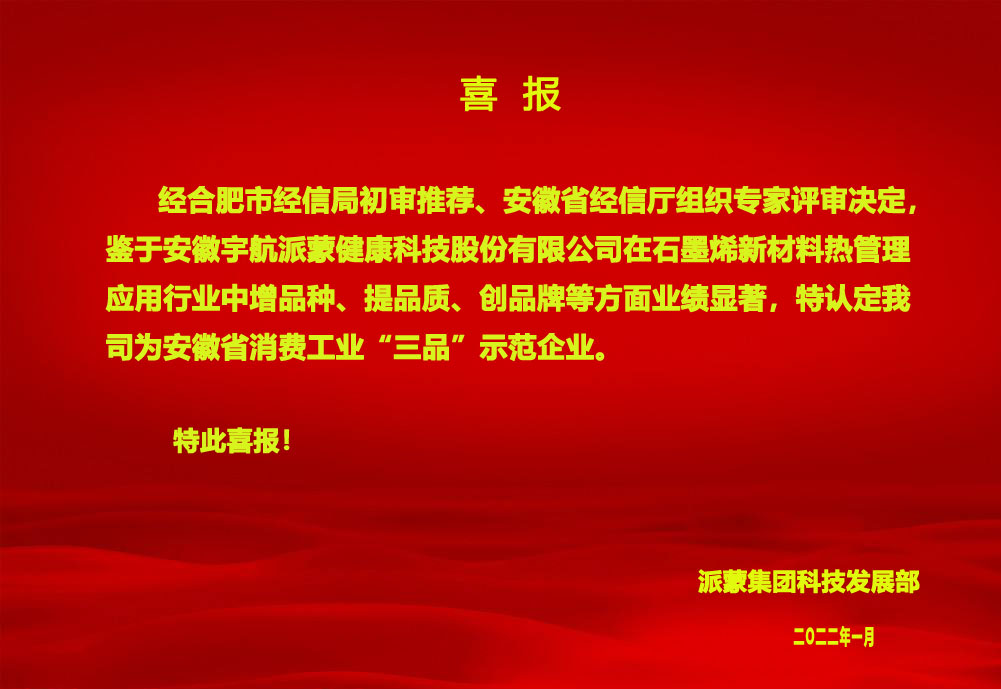 El mes pasado, Grupo PMA fue seleccionada por el Departamento Provincial de Economía y Tecnología de la Información de Anhui como la Empresa de Demostración de "Tres Grados" de la Industria Provincial de Bienes de Consumo. Mejore la calidad y cree conciencia de marca, concéntrese en mejorar la calidad y la eficiencia y la optimización y actualización industrial, y acelere la promoción del desarrollo de alta calidad de la industria provincial de bienes de consumo.